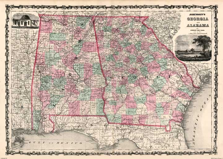 Alabama and Georgia; published by A. J. Johnson; 1865. Created from an original copy; 18" x 26" |