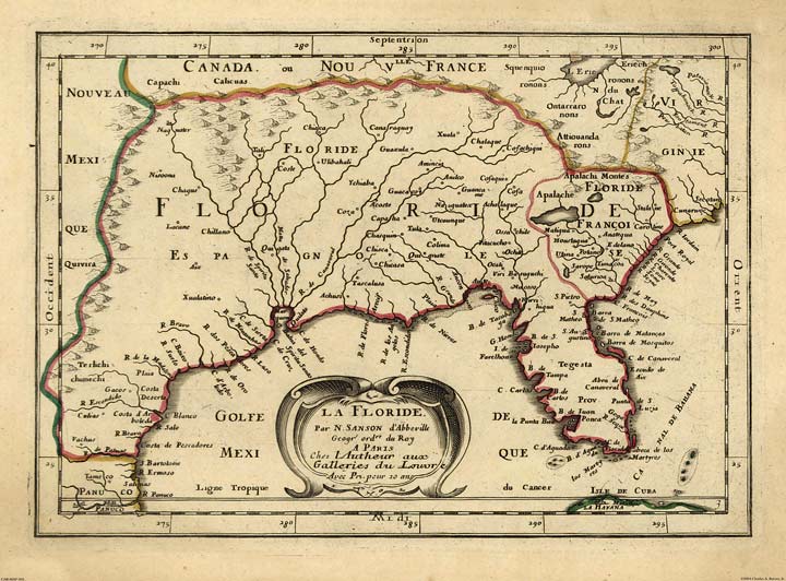 Southeastern U.S.; Nicolas Sanson; 1657. Created from a print at the Library of Congress Archives; printed 15" h x 21" w. |
