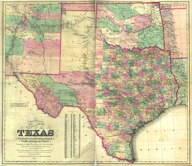 Colton's New Map of the State of Texas; 1872. Created from a copy at the Library of Congress Archives; 31" x 37" |