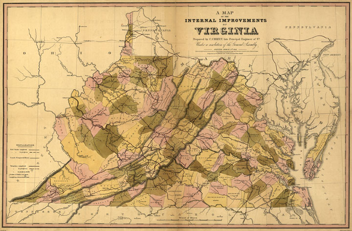 A map of the internal imporovements of Virginia...; Claudiua Crozet; 1848. Created from a copy at the Library of Congress Archives; 22" x 32" |