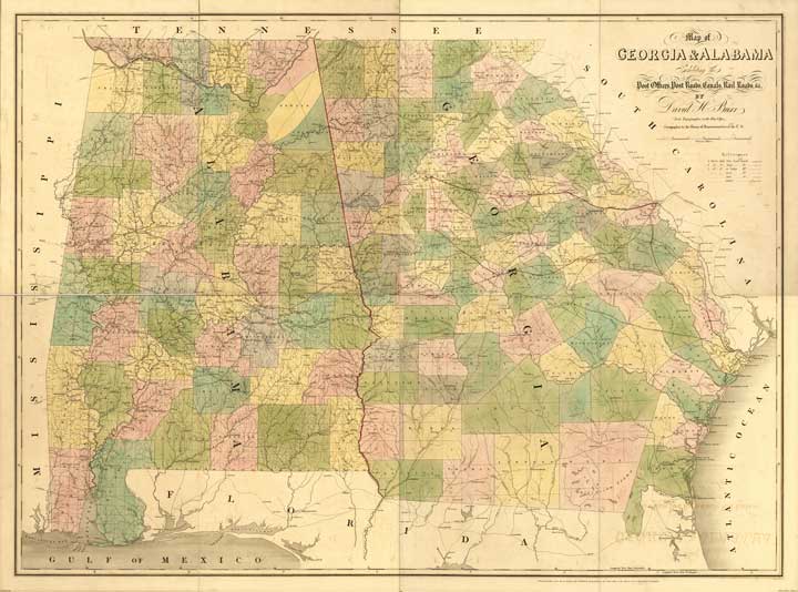Alabama and Georgia; published by S. A. Mitchell; 1860. Created from an original copy; 17" h x 22" w (slightly larger than the original). |