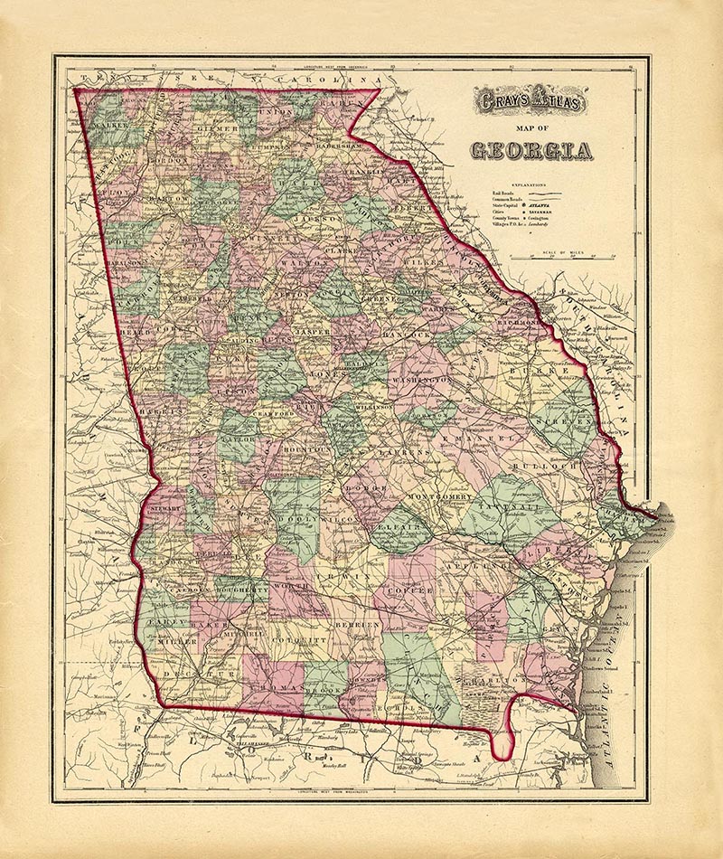 Georgia; Gray's Atlas; 1874. Created from an original copy; 17" h x 22" w (slightly larger than the original). |